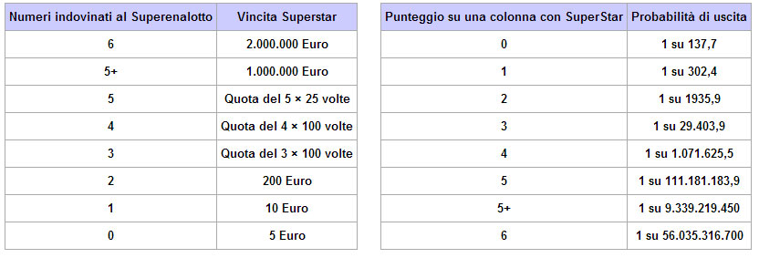 | 3 | 09/02/2010 | 139.022.314,64 € | Parma e Pistoia | Nello stesso concorso sono stati centrati due "sei" che si sono divisi il jackpot a metà, incassando 69.511.157,32 € a testa[10] |